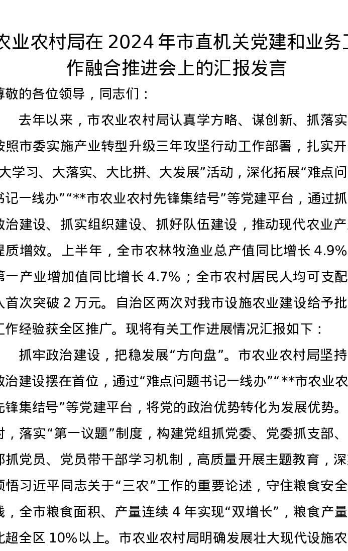 农业农村局在2024年市直机关党建和业务工作融合推进会上的汇报发言