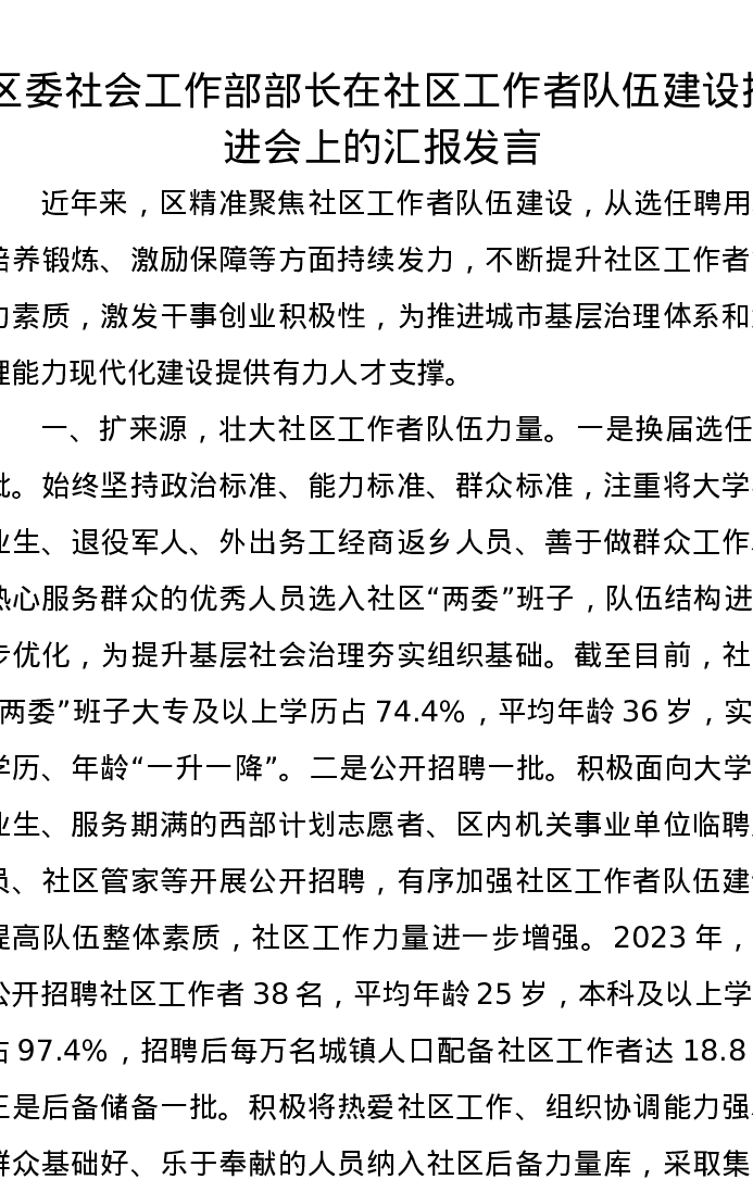 区委社会工作部部长在社区工作者队伍建设推进会上的汇报发言
