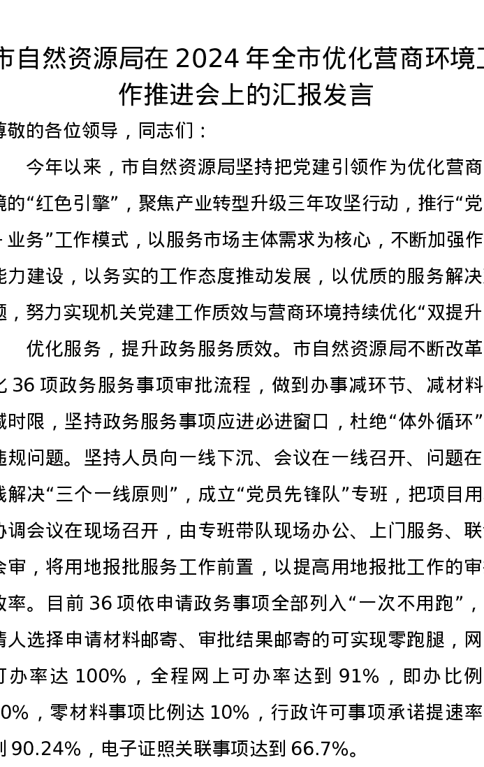 市自然资源局在2024年全市优化营商环境工作推进会上的汇报发言