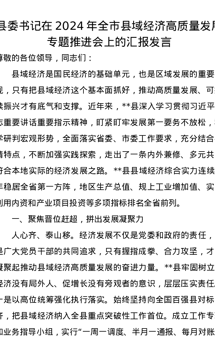 县委书记在2024年全市县域经济高质量发展专题推进会上的汇报发言