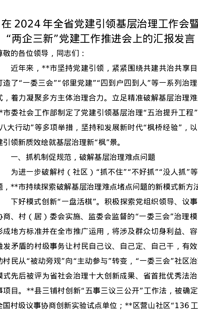 在2024年全省党建引领基层治理工作会暨“两企三新”党建工作推进会上的汇报发言