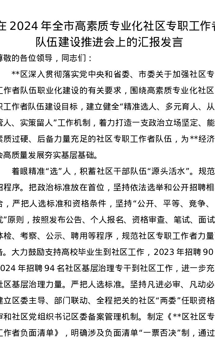 在2024年全市高素质专业化社区专职工作者队伍建设推进会上的汇报发言