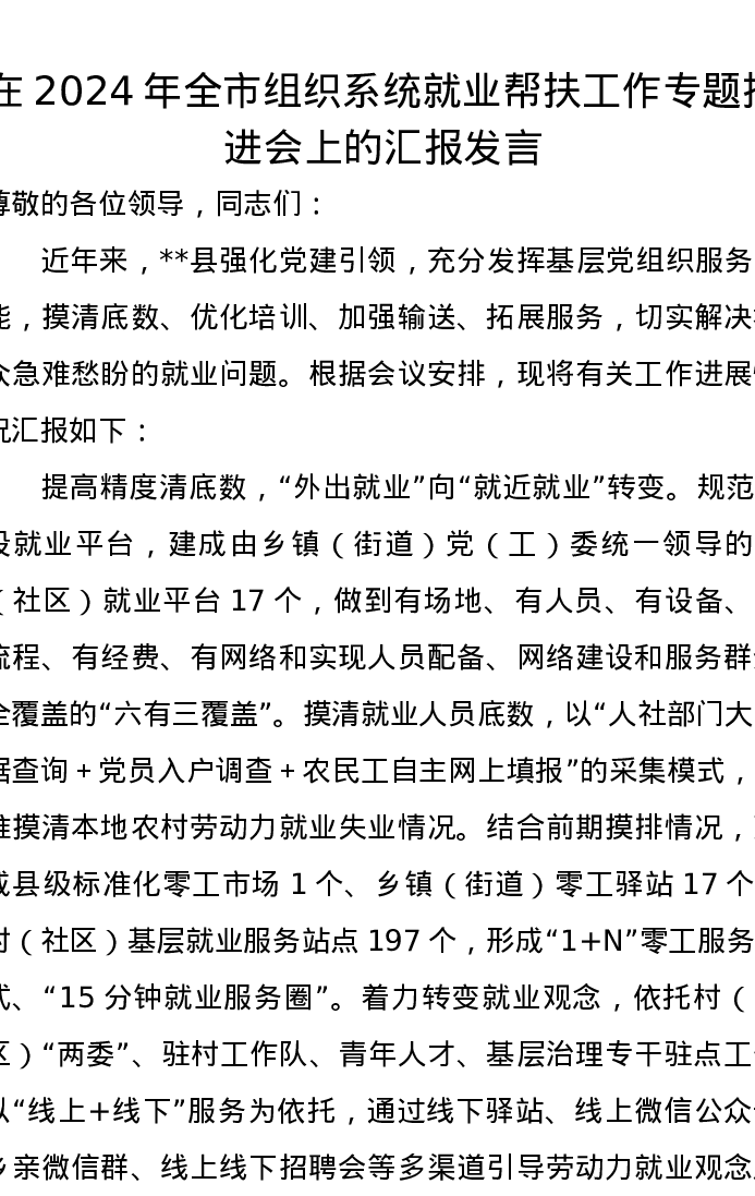 在2024年全市组织系统就业帮扶工作专题推进会上的汇报发言