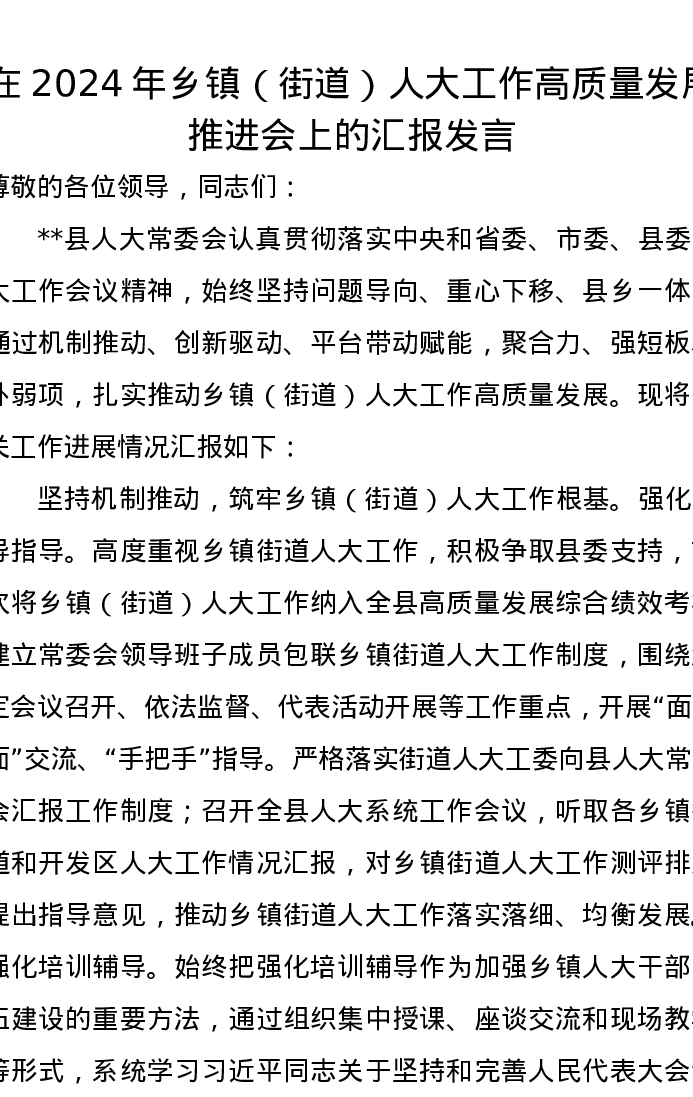 在2024年乡镇(街道)人大工作高质量发展推进会上的汇报发言