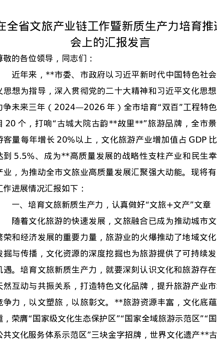 在全省文旅产业链工作暨新质生产力培育推进会上的汇报发言