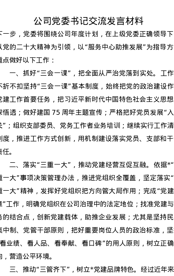 公司党委书记交流发言材料