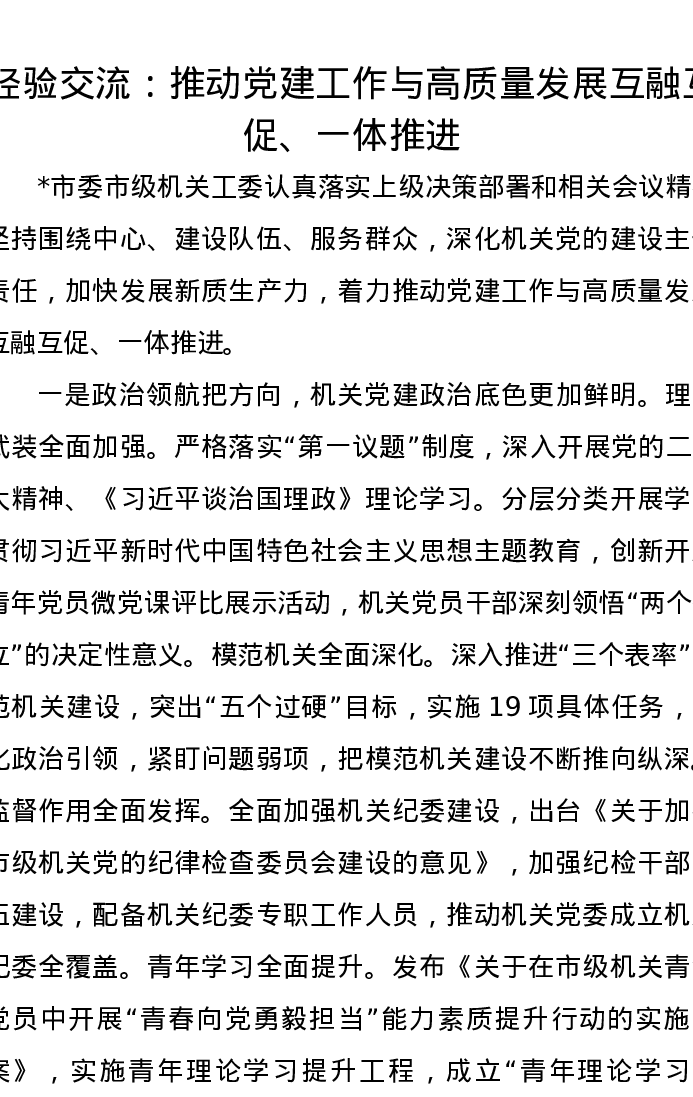 经验交流:推动党建工作与高质量发展互融互促、一体推进