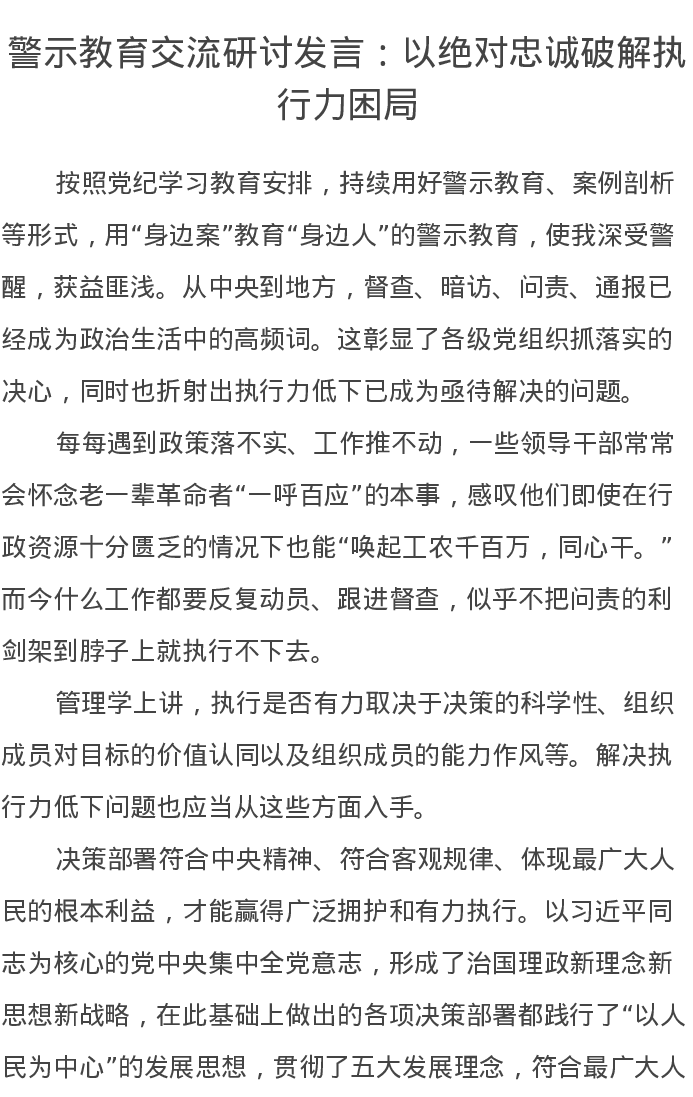 警示教育交流研讨发言:以绝对忠诚破解执行力困局