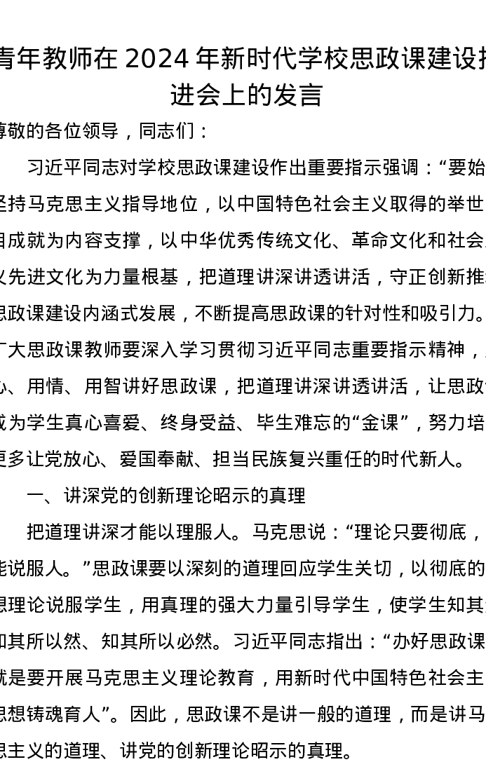 青年教师在2024年新时代学校思政课建设推进会上的发言