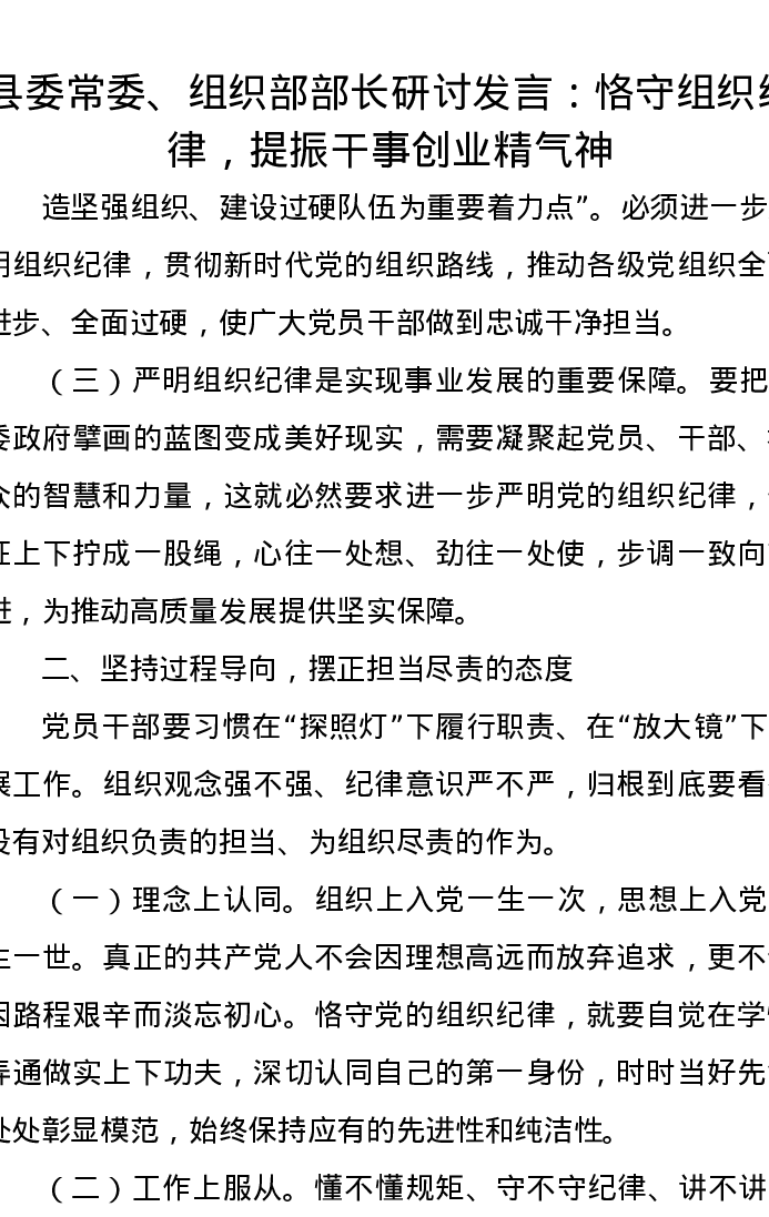 县委常委、组织部部长研讨发言:恪守组织纪律,提振干事创业精气神