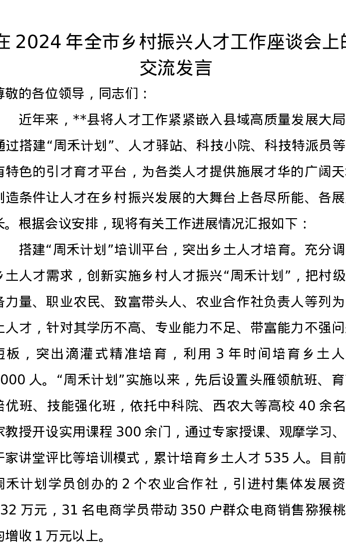在2024年全市乡村振兴人才工作座谈会上的交流发言