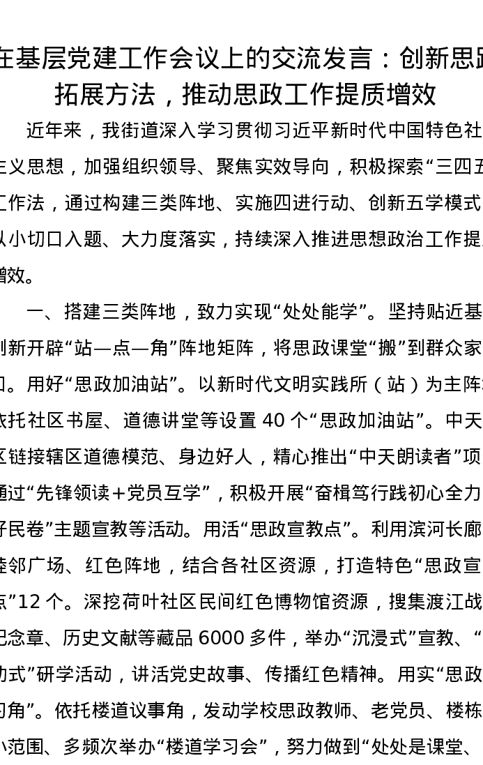 在基层党建工作会议上的交流发言:创新思路拓展方法,推动思政工作提质增效