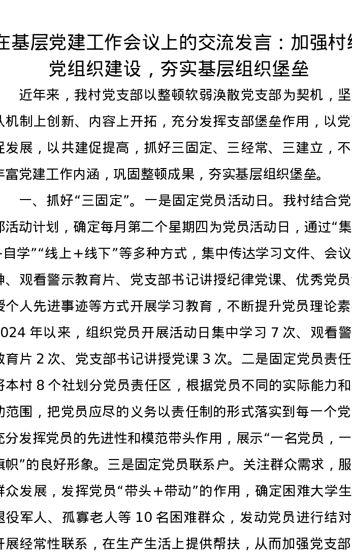 在基层党建工作会议上的交流发言:加强村级党组织建设,夯实基层组织堡垒