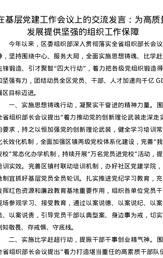 在基层党建工作会议上的交流发言:为高质量发展提供坚强的组织工作保障
