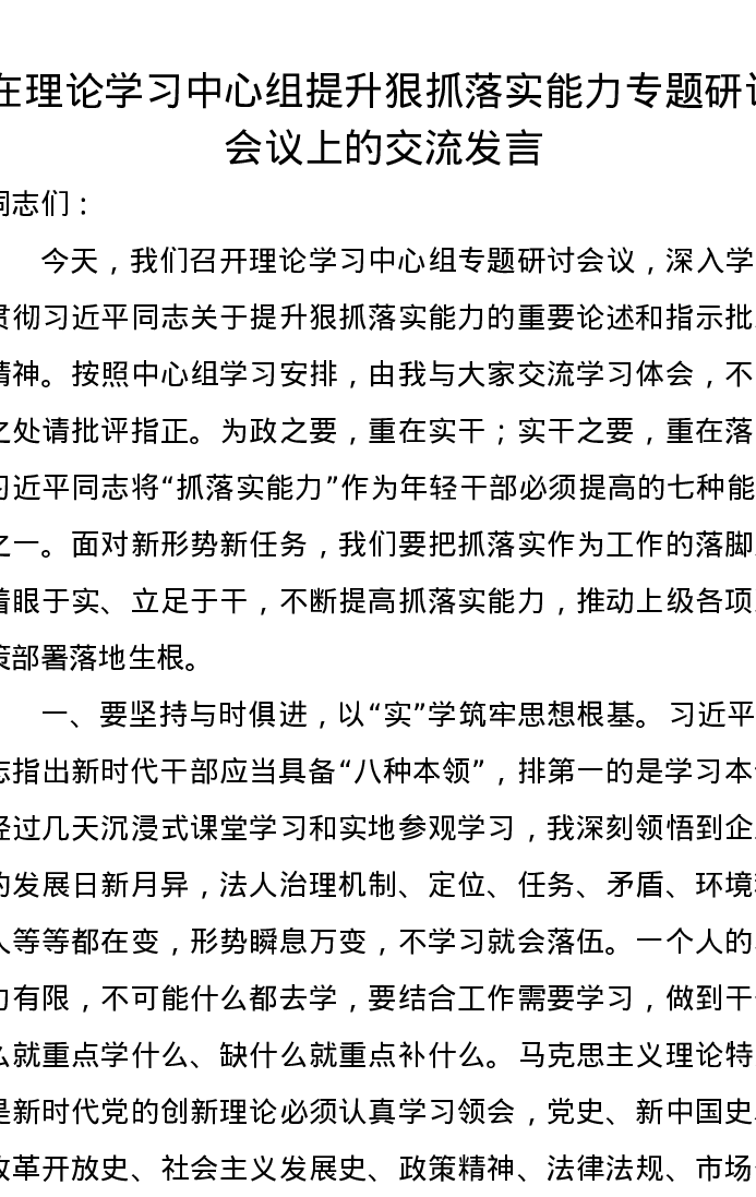 在理论学习中心组提升狠抓落实能力专题研讨会议上的交流发言