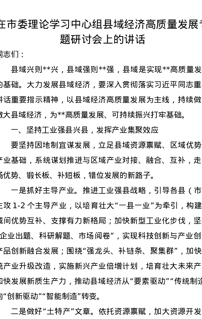 在市委理论学习中心组县域经济高质量发展专题研讨会上的讲话