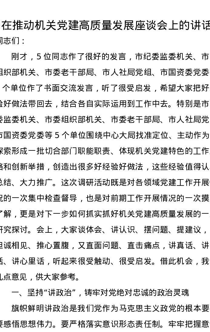在推动机关党建高质量发展座谈会上的讲话
