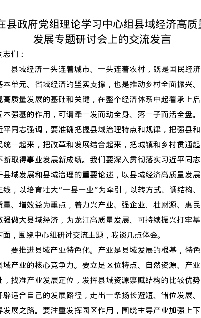 在县政府党组理论学习中心组县域经济高质量发展专题研讨会上的交流发言
