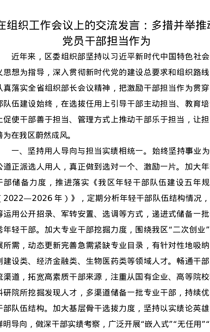 在组织工作会议上的交流发言:多措并举推动党员干部担当作为