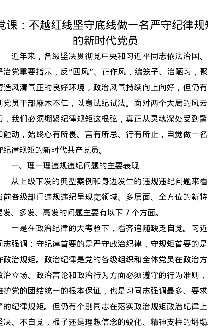 党课讲稿:不越红线坚守底线做一名严守纪律规矩的新时代党员