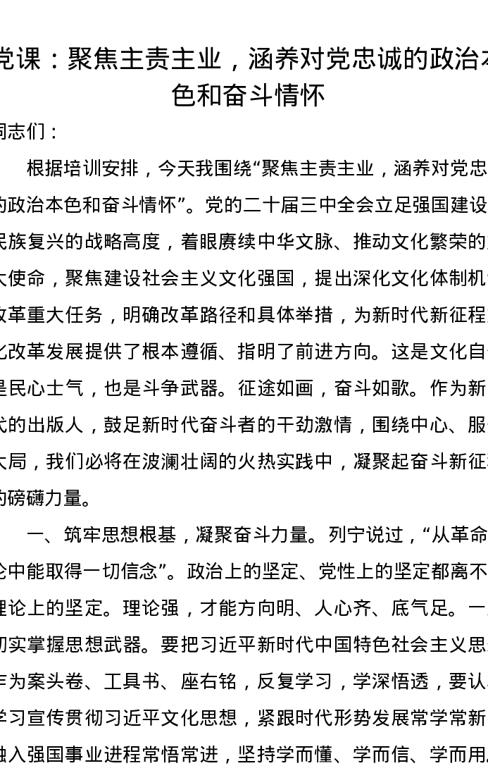 党课讲稿:聚焦主责主业,涵养对党忠诚的政治本色和奋斗情怀