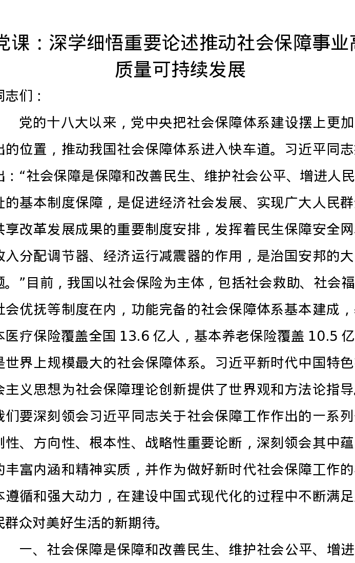 党课讲稿:深学细悟重要论述推动社会保障事业高质量可持续发展