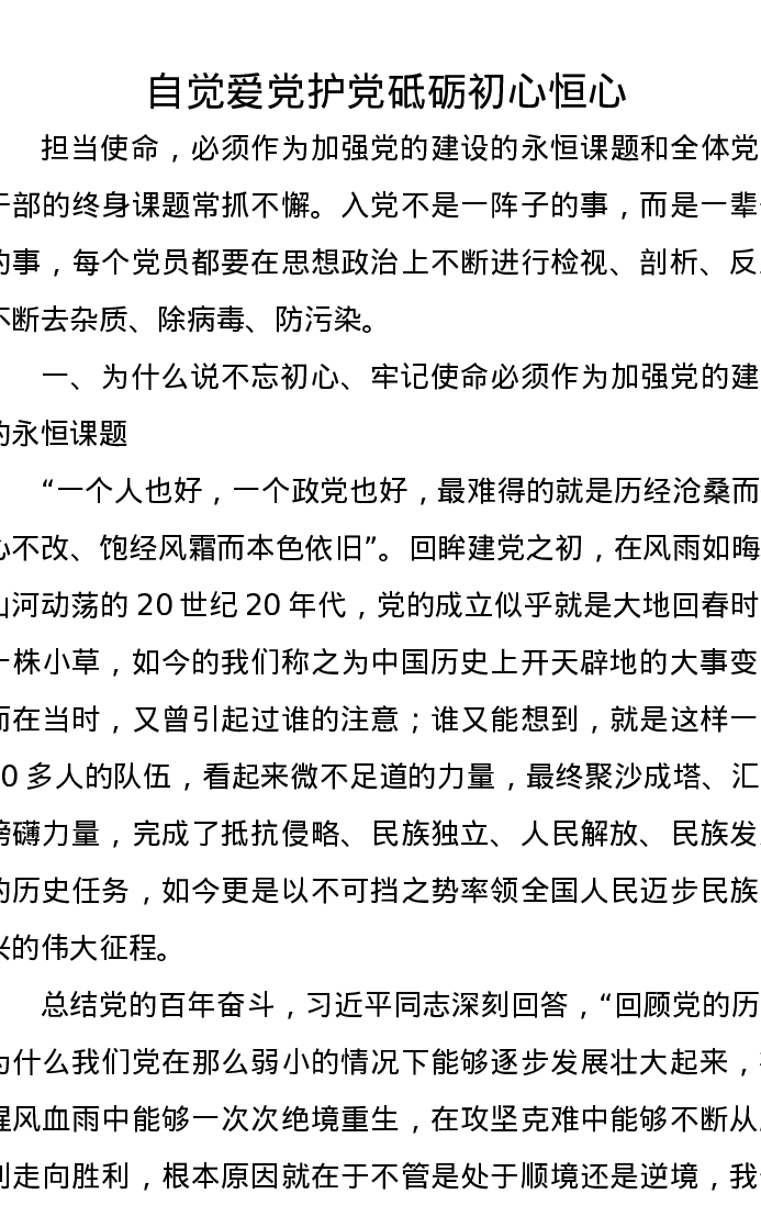 党课讲稿:自觉爱党护党砥砺初心恒心