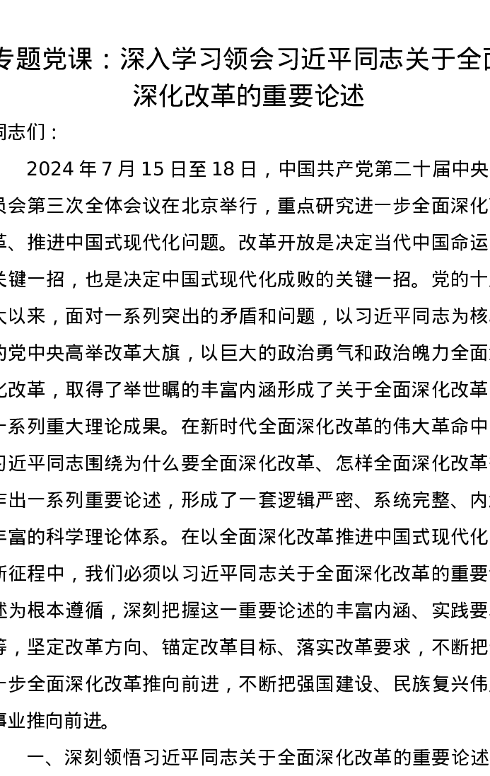 专题党课讲稿:深入学习领会习近平总书记关于全面深化改革的重要论述