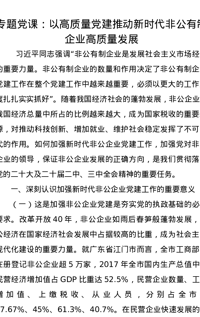 党课讲稿:以高质量党建推动新时代非公有制企业高质量发展