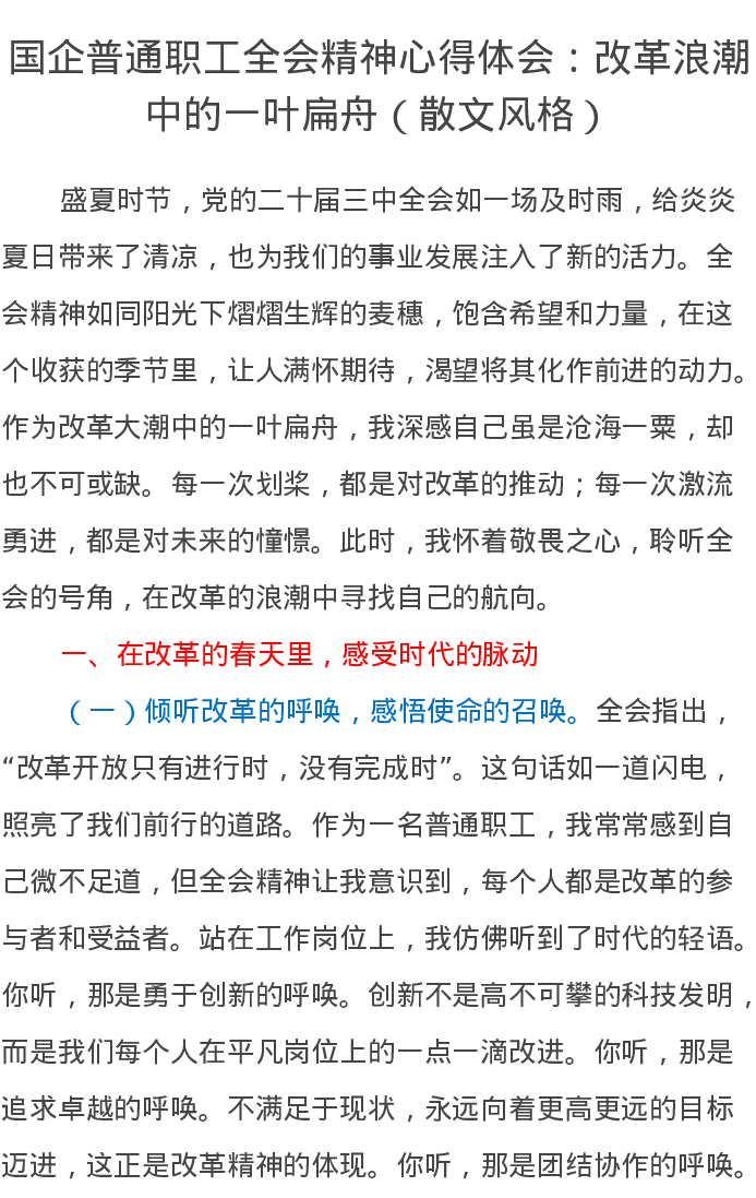 国企普通职工全会精神心得体会:改革浪潮中的一叶扁舟