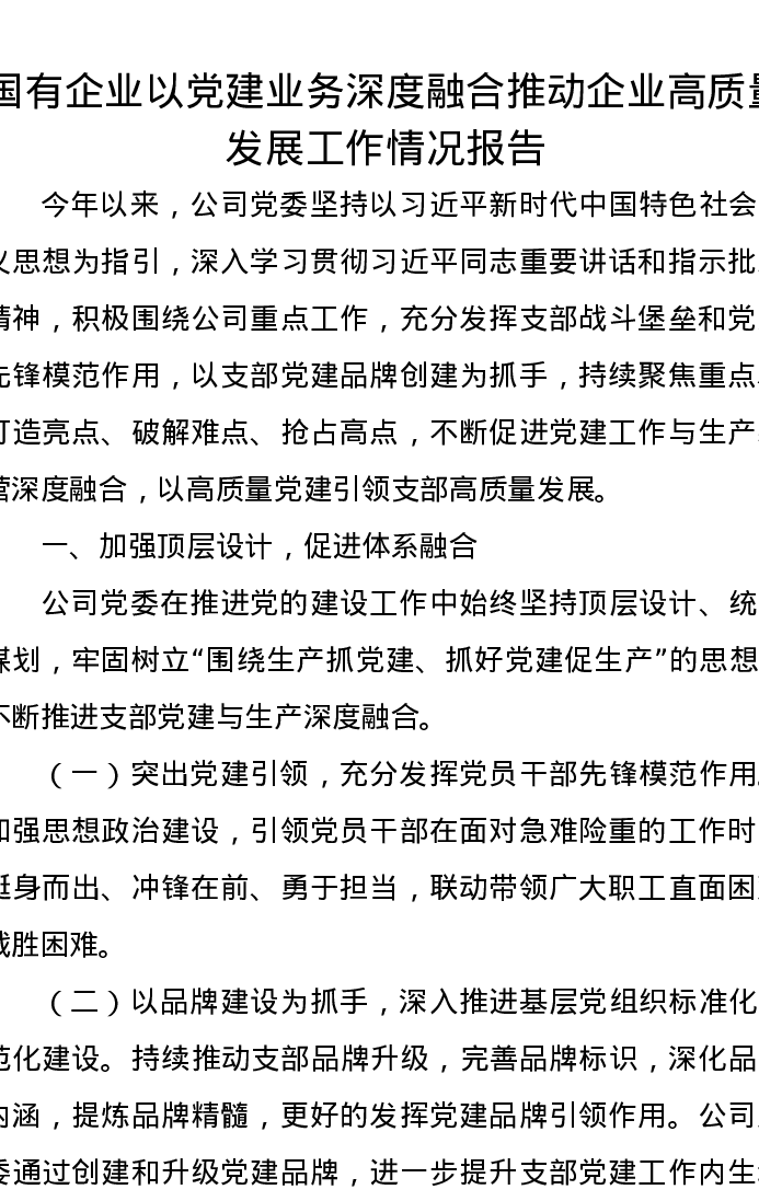 国有企业以党建业务深度融合推动企业高质量发展工作情况报告