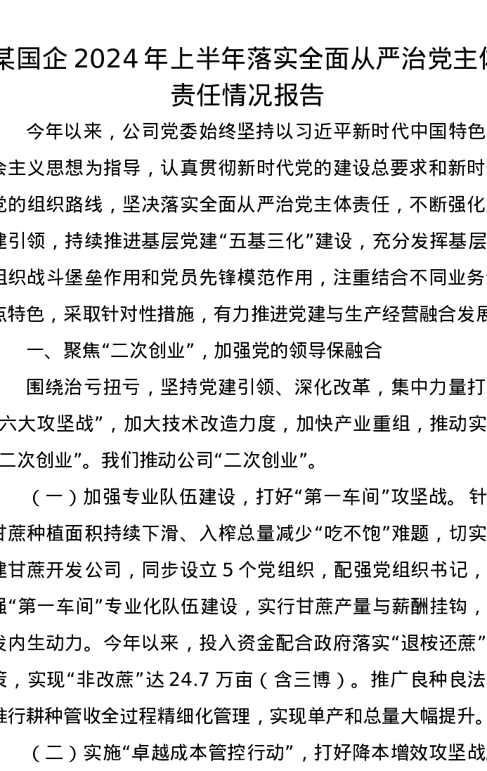 某国企2024年上半年落实全面从严治党主体责任情况报告