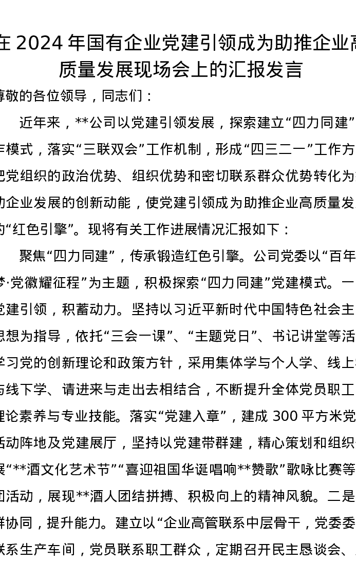 在2024年国有企业党建引领成为助推企业高质量发展现场会上的汇报发言