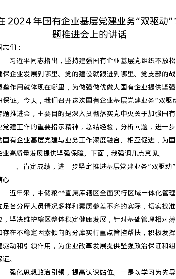 在2024年国有企业基层党建业务“双驱动”专题推进会上的讲话