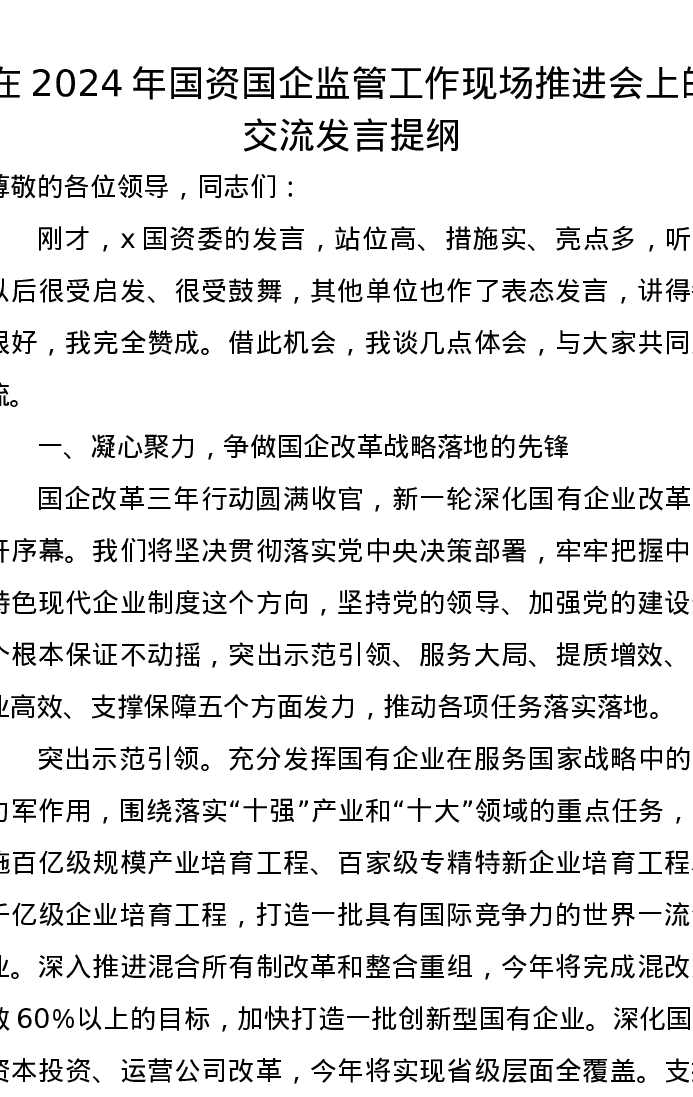 在2024年国资国企监管工作现场推进会上的交流发言提纲