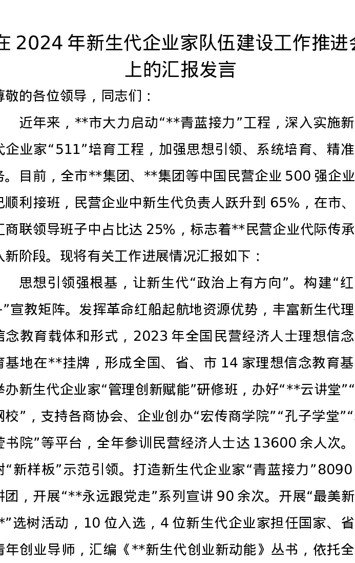 在2024年新生代企业家队伍建设工作推进会上的汇报发言