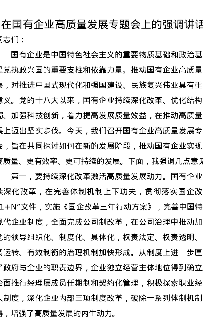 在国有企业高质量发展专题会上的强调讲话