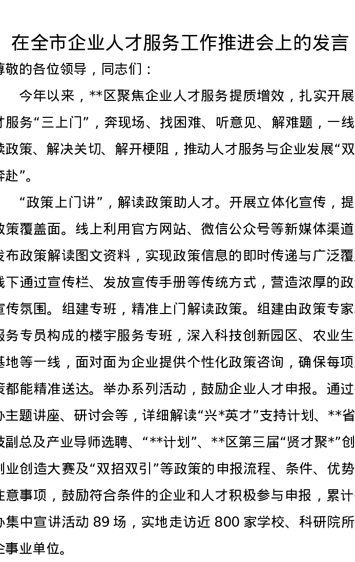 在全市企业人才服务工作推进会上的发言