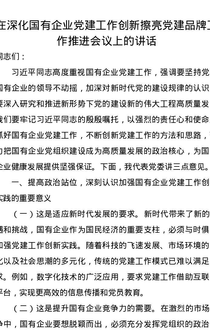 在深化国有企业党建工作创新擦亮党建品牌工作推进会议上的讲话
