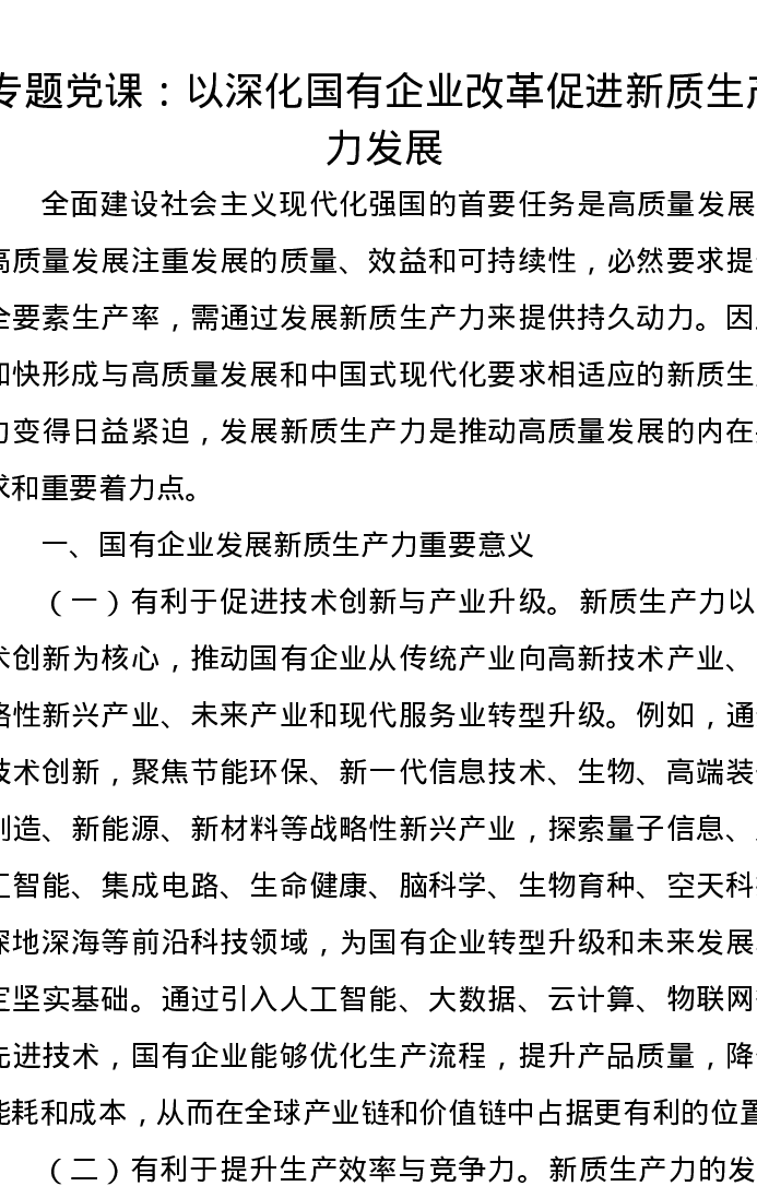 专题党课讲稿:以深化国有企业改革促进新质生产力发展