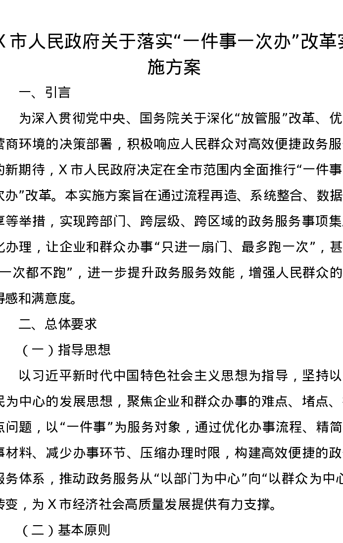 X市人民政府关于落实“一件事一次办”改革实施方案