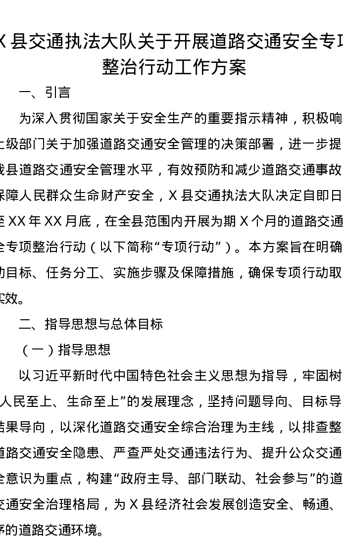 X县交通执法大队关于开展道路交通安全专项整治行动工作方案