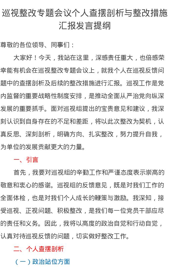 巡视整改专题会议个人查摆剖析与整改措施汇报发言提纲
