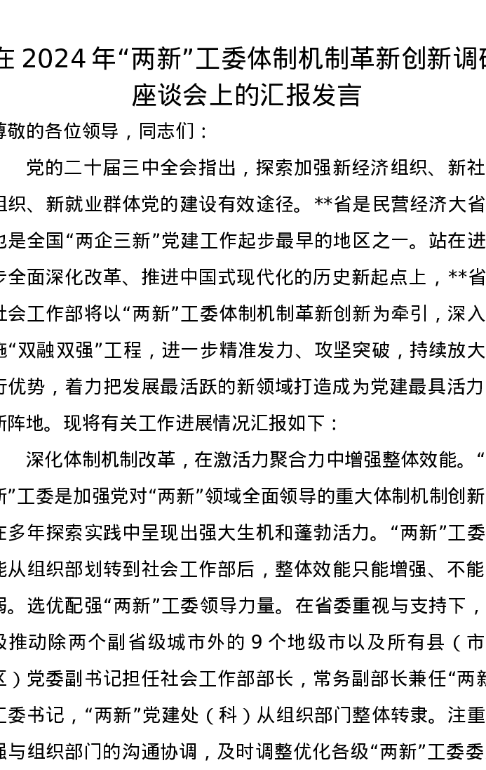 在2024年“两新”工委体制机制革新创新调研座谈会上的汇报发言