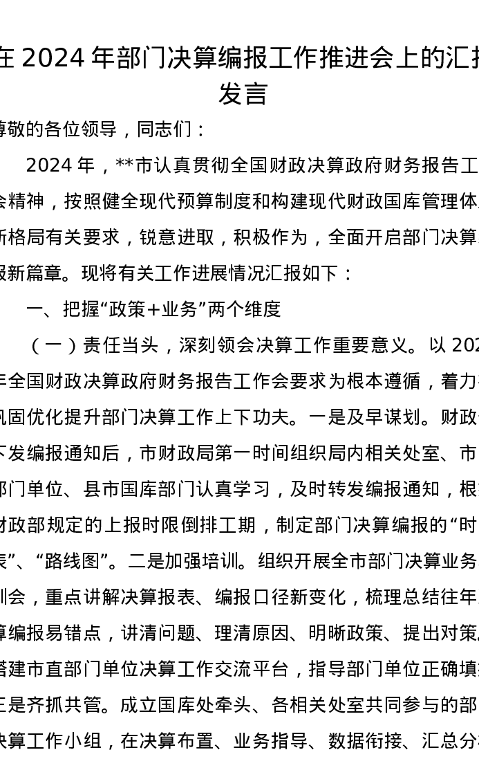 在2024年部门决算编报工作推进会上的汇报发言