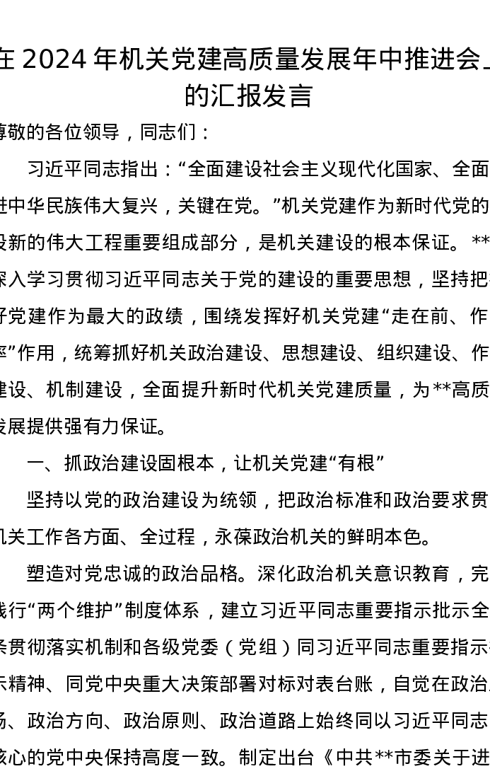 在2024年机关党建高质量发展年中推进会上的汇报发言
