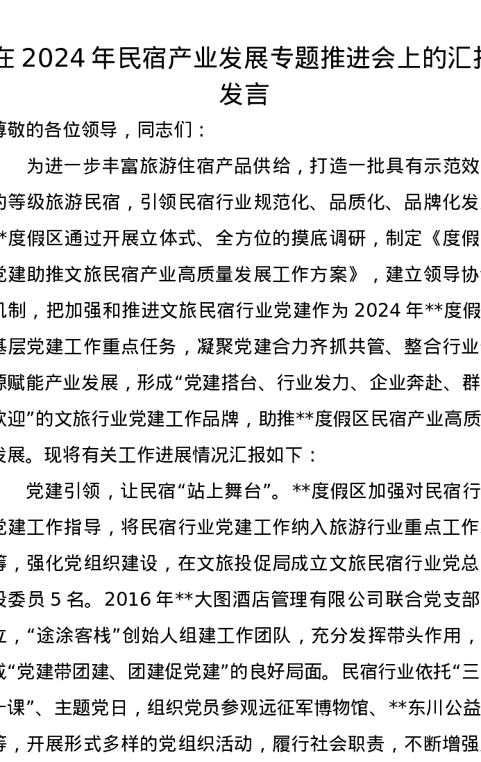 在2024年民宿产业发展专题推进会上的汇报发言