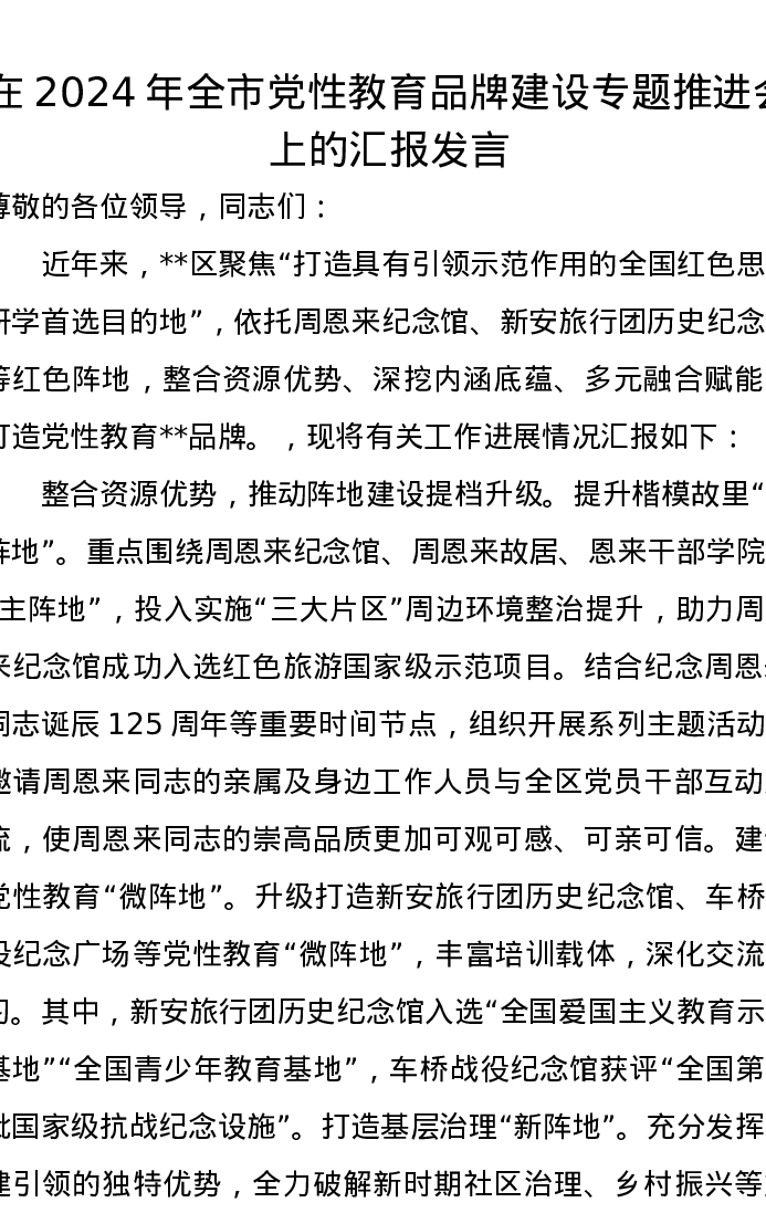 在2024年全市党性教育品牌建设专题推进会上的汇报发言