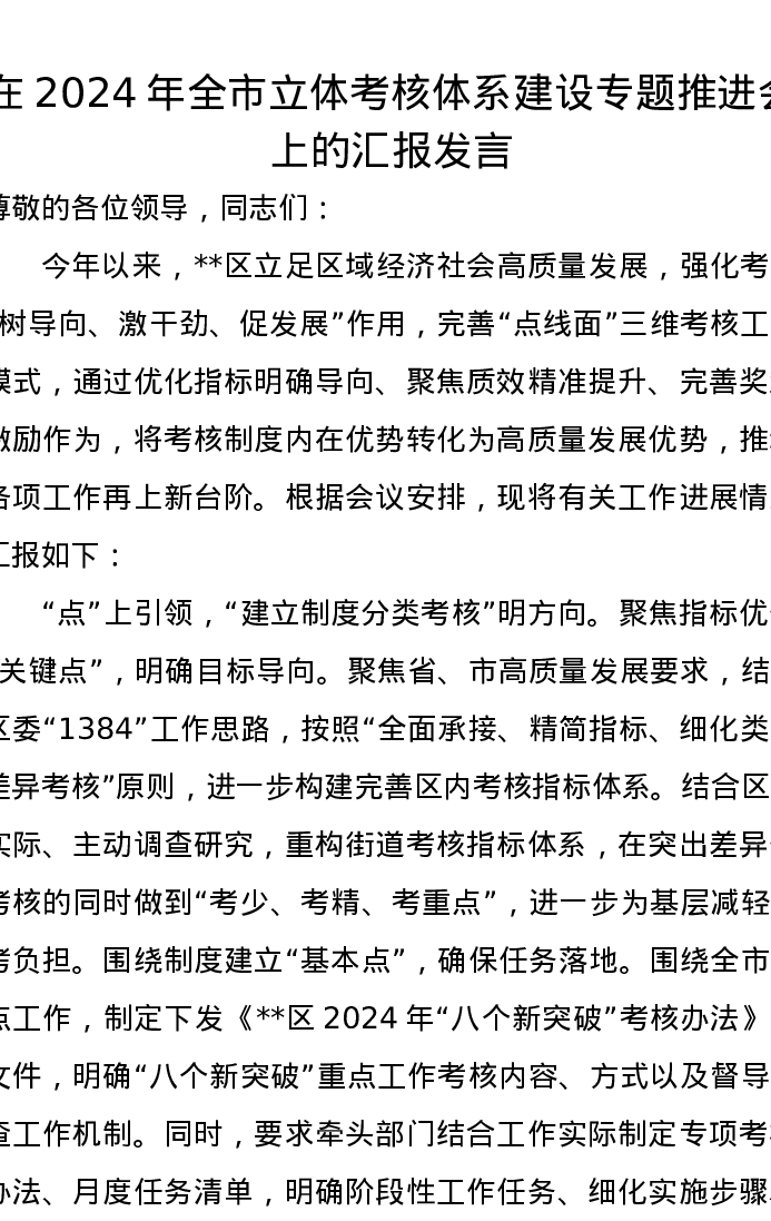 在2024年全市立体考核体系建设专题推进会上的汇报发言