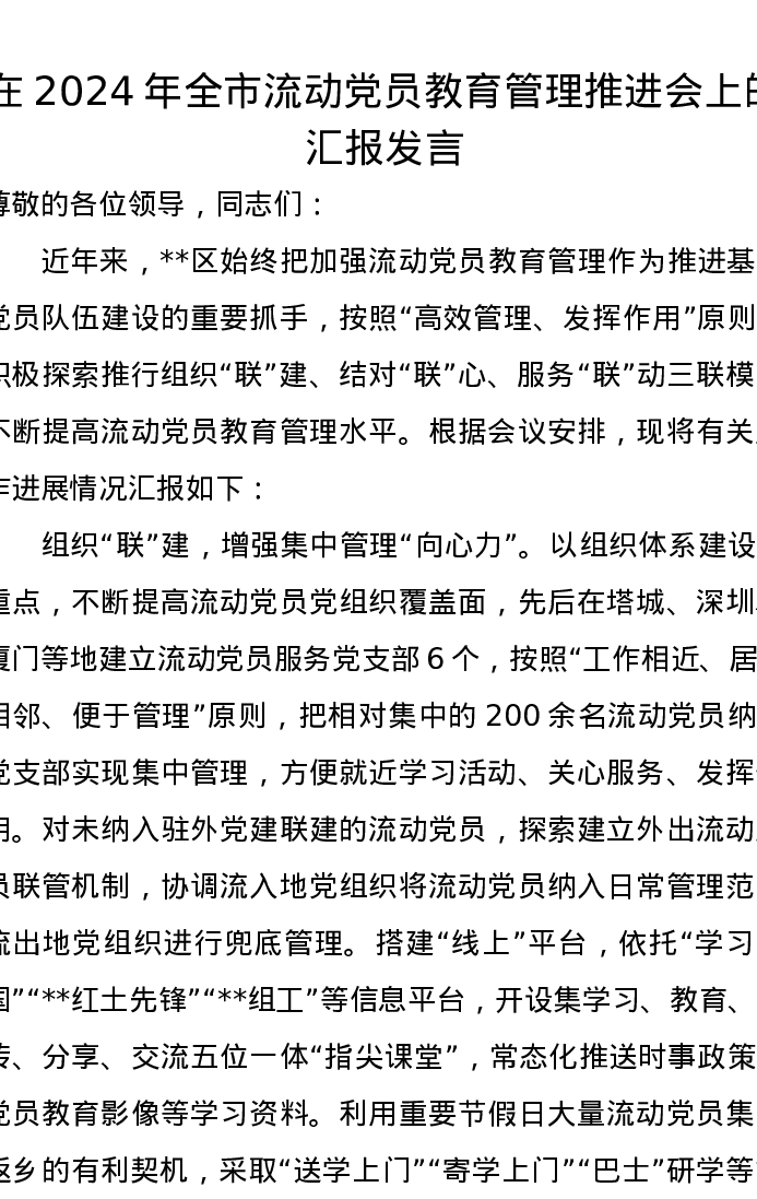 在2024年全市流动党员教育管理推进会上的汇报发言